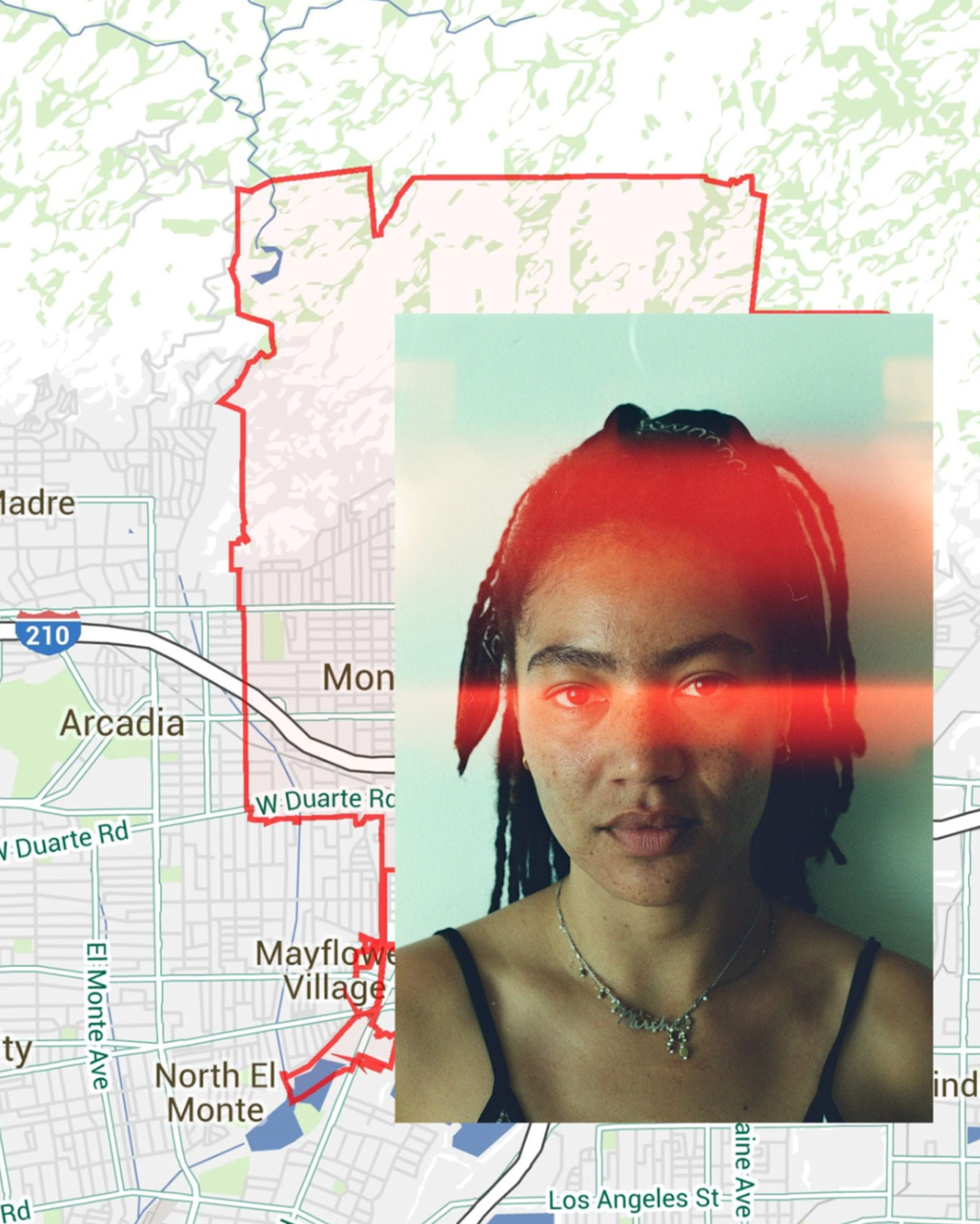 Prior to the 1950s, Santa Monica was home to a thriving and sizable black community within the Belmar neighborhood and on Broadway between 14th and 20th street. Through eminent domain more than 500 families were displaced to build the Santa Monica Civic Center and I-10 freeway. In Held Within My Own Arms Nasir Grissom re-establishes the black community archive within the Santa Monica coastline. Like a beacon, Grissom’s photograph pulls you in and haunts. The circular form investigates the ability for the image to be a navigational object. By layering archival photos of the community in their everyday surroundings within the Pacific Ocean, this piece hones in on the permeable barrier between life, death, and memory along U.S. waterways. Here, Grissom evokes Tina Campt’s idea of “Haptic photos.” In its title, the work invites the viewer to the ocean as an altar space, a space for care, and response to environmental weathering.